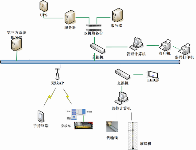 此系統(tǒng)為自動(dòng)化存取庫(kù)房,各穿梭貨架通道內(nèi)的貨物由穿梭車(chē)搬運(yùn)取送,貨物在各通道端口的上下架及穿梭車(chē)的換通道,由堆垛機(jī)完成,結(jié)合輸送線(xiàn)的設(shè)置,實(shí)現(xiàn)貨物自庫(kù)前出入貨口以?xún)?nèi)存儲(chǔ)區(qū)域的存取全過(guò)程自動(dòng)化。